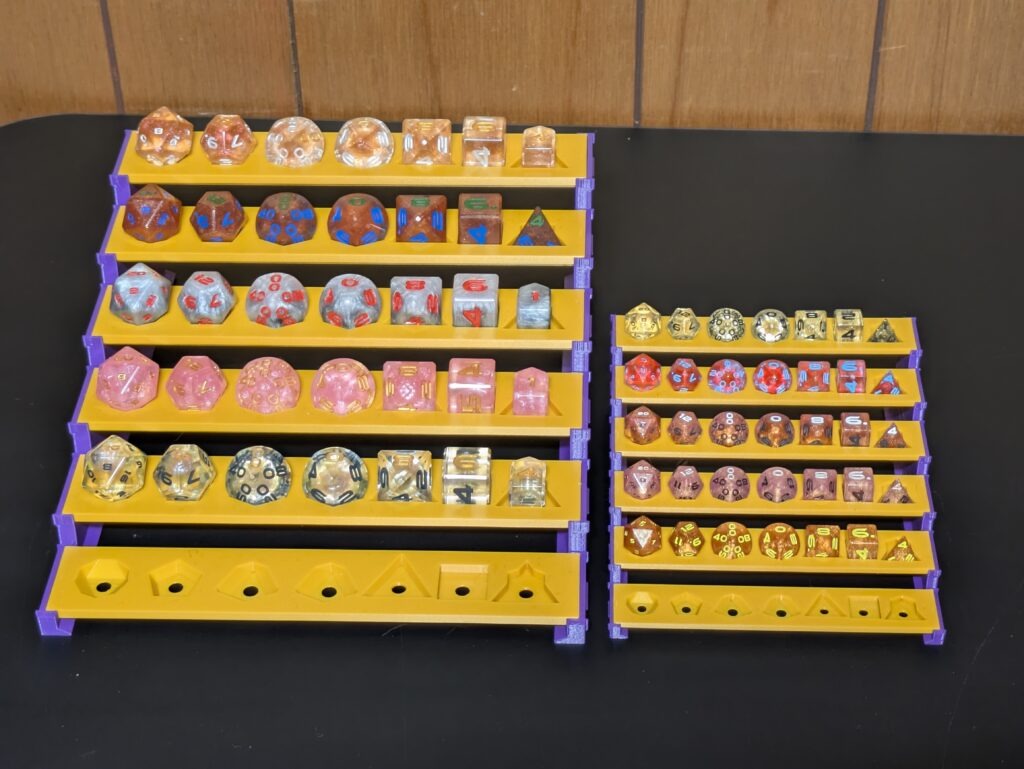 Modular dice stands and trays for your standard 16mm-20mm D&D/Pathfinder dice. Mix and match stands for dice sets or d20s from 2 to 6 tiers. Prints without supports, gluing stands is recommended. If you don’t want to glue them and want to disassemble and reassemble, printing the trays on their side with a brim is recommended for better tab strength.