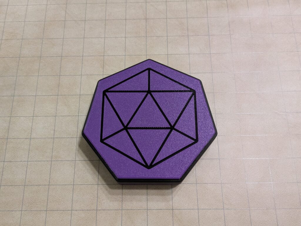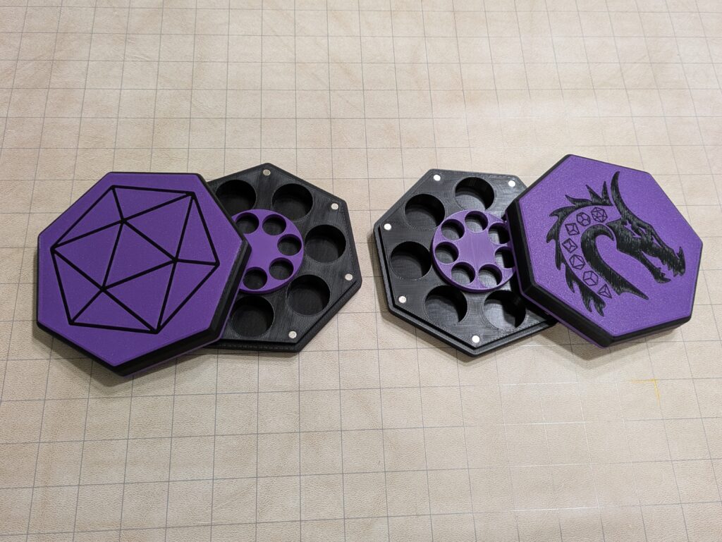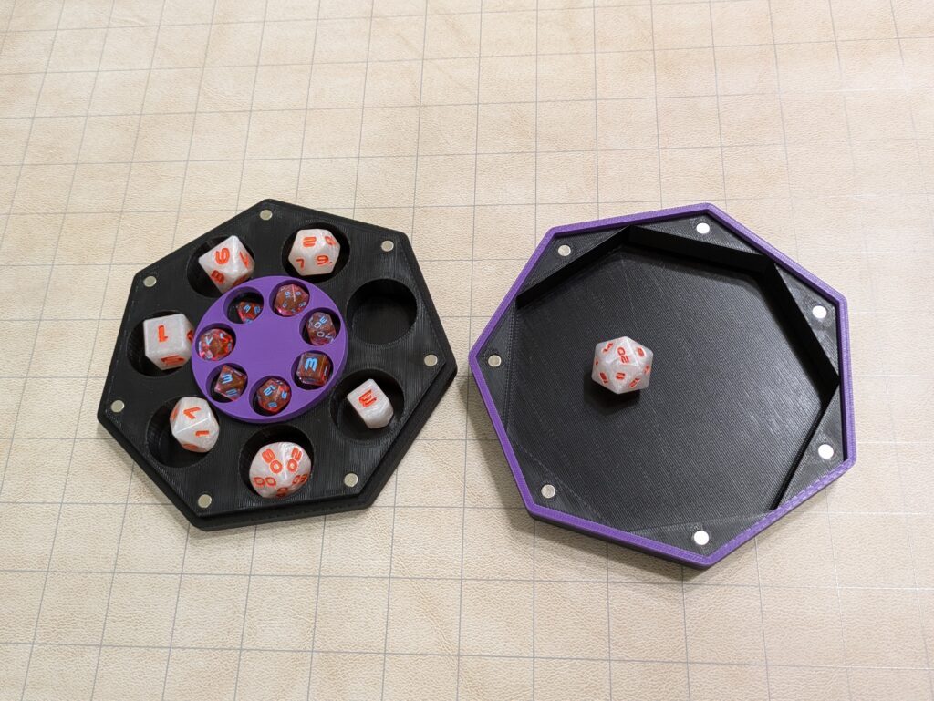 It doubles as a case for a set of 7 of regular (16-20mm) and a set of 7 mini (10-12mm) RPG dice where the lid can be used as a dice tray. Clasps with 14 magnets (5mmx2mm). Print the insert in flexible filament for a softer dice roll, or cut and adhere felt.